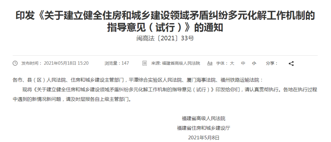 近日,福建省高級人民法院、福建省住房和城鄉(xiāng)建設(shè)廳印發(fā)《關(guān)于建立健全住房和城鄉(xiāng)建設(shè)領(lǐng)域矛盾糾紛多元化解工作機制的指導意見(試行)》的通知(閩高法〔2021〕33號)。
