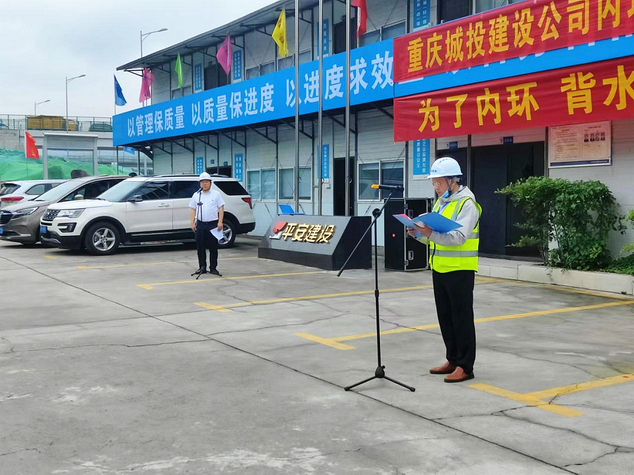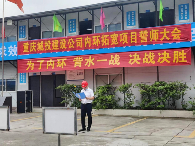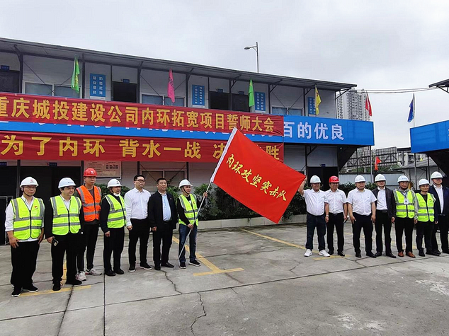 決戰(zhàn)決勝誓師大會(huì)現(xiàn)場(chǎng),重慶城投建設(shè)公司黨委委員、副總經(jīng)理?xiàng)钴姶砉緸閮?nèi)環(huán)攻堅(jiān)突擊隊(duì)授旗。全體突擊隊(duì)員在宣誓中表示將“為了內(nèi)環(huán)、背水一戰(zhàn)、決戰(zhàn)決勝”,取得攻堅(jiān)戰(zhàn)的全面勝利,確保項(xiàng)目于今年年底前完成內(nèi)環(huán)主線通車任務(wù)。